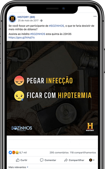 Para a quarta temporada de Sozinhos, consagrado show do History Channel em que participantes são deixados numa ilha inóspita, nossa missão era ressaltar as adversidades e pouquíssimos recursos com que cada participante podia contar. Através de peças interativas e imersivas mostramos as emoções vividas na ilha, tentando trazer o usuário para dentro da série e acompanhar a quarta temporada, até então, inédita na TV. Foram mais de 2.800.000 visualizações únicas e um taxa de visualização de 55% dentre a audiência impactada.